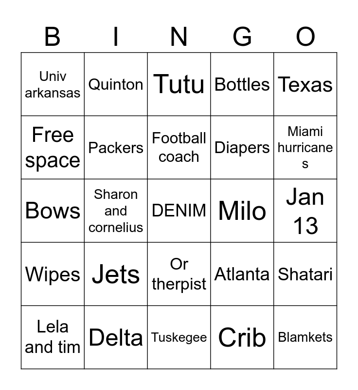 This bingo card has a free space and 24 words: Lela and tim, Jets, Football coach, Crib, Texas, Univ arkansas, Quinton, Tutu, Milo, Jan 13, Bows, Packers, Atlanta, Shatari, Free space, Delta, Tuskegee, Bottles, Miami hurricane s, Wipes, Sharon and cornelius, Or therpist, Diapers and Blamkets.