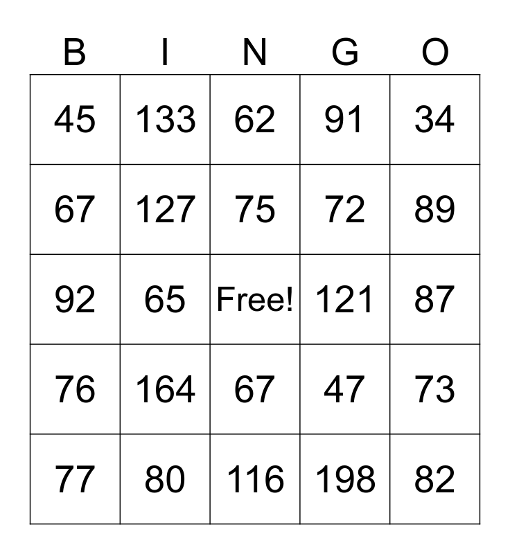This bingo card has a free space and 51 words: 117, 82, 106, 116, 164, 64, 133, 35, 67, 142, 127, 91, 73, 47, 119, 107, 75, 121, 90, 34, 65, 198, 45, 72, 105, 70, 89, 93, 77, 62, 72, 71, 64, 80, 26, 80, 90, 74, 40, 60, 87, 76, 56, 64, 25, 31, 92, 88, 57, 67 and 93.