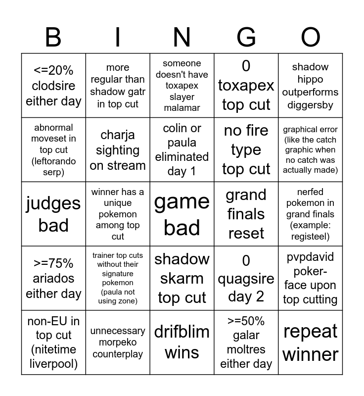 This bingo card has a free space and 24 words: trainer top cuts without their signature pokemon (paula not using zone), unnecessary morpeko counterplay, colin or paula eliminated day 1, non-EU in top cut (nitetime liverpool), shadow hippo outperforms diggersby, <=20% clodsire either day, abnormal moveset in top cut (leftorando serp), more regular than shadow gatr in top cut, grand finals reset, shadow skarm top cut, no fire type top cut, judges bad, 0 quagsire day 2, pvpdavid poker-face upon top cutting, charja sighting on stream, >=50% galar moltres either day, nerfed pokemon in grand finals (example: registeel), someone doesn't have toxapex slayer malamar, graphical error (like the catch graphic when no catch was actually made), winner has a unique pokemon among top cut, repeat winner, >=75% ariados either day, 0 toxapex top cut and drifblim wins.
