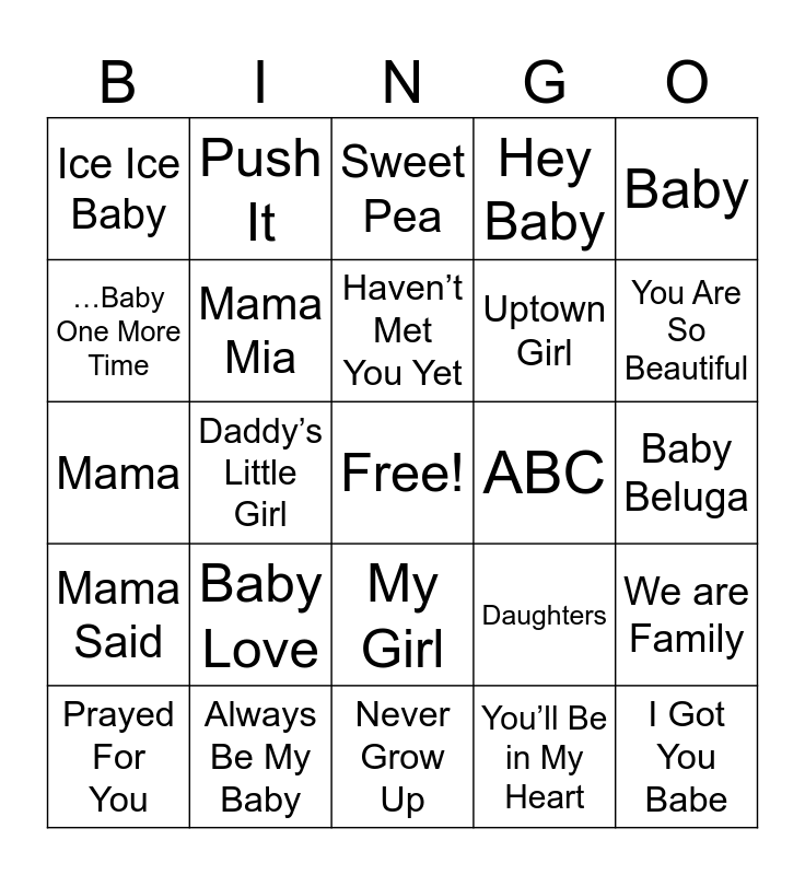 This bingo card has a free space and 24 words: Baby Love, Always Be My Baby, Haven’t Met You Yet, Prayed For You, Baby, Ice Ice Baby, …Baby One More Time, Push It, ABC, My Girl, Uptown Girl, Mama, Daughters, We are Family, Mama Mia, You’ll Be in My Heart, Baby Beluga, Sweet Pea, You Are So Beautiful, Daddy’s Little Girl, I Got You Babe, Mama Said, Hey Baby and Never Grow Up.