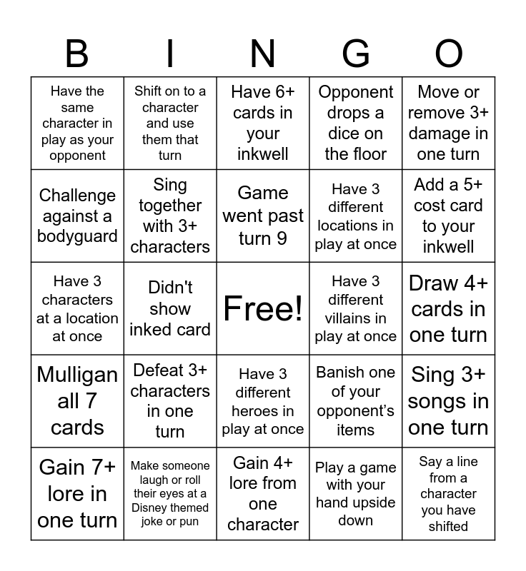 This bingo card has a free space and 25 words: Defeat 3+ characters in one turn, Gain 4+ lore from one character, Game went past turn 9, Gain 7+ lore in one turn, Move or remove 3+ damage in one turn, Have the same character in play as your opponent, Challenge against a bodyguard, Shift on to a character and use them that turn, Have 3 different villains in play at once, Have 3 different heroes in play at once, Have 3 different locations in play at once, Have 3 characters at a location at once, Banish one of your opponent’s items, Sing 3+ songs in one turn, Sing together with 3+ characters, Have 3+ items in play at once, Draw 4+ cards in one turn, Have 6+ cards in your inkwell, Add a 5+ cost card to your inkwell, Didn't show inked card, Say a line from a character you have shifted, Make someone laugh or roll their eyes at a Disney themed joke or pun, Mulligan all 7 cards, Opponent drops a dice on the floor and Play a game with your hand upside down.