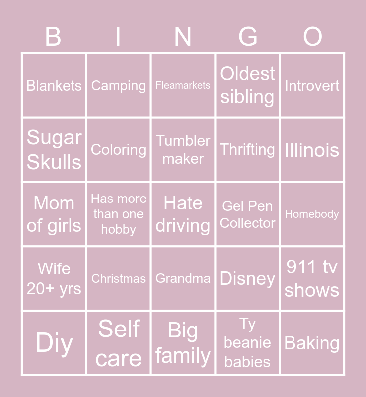 This bingo card has 30 words: Diy, Biker romance reader, Tumbler maker, 53yrs younge, Introvert, Blankets, Camping, Grandma, Gel Pen Collector, Baking, Wife 20+ yrs, Coloring, Free!, Ty beanie babies, 911 tv shows, Have alopecia, Has more than one hobby, Hate driving, Disney, Illinois, Mom of girls, Self care, Fleamarkets, Thrifting, Homebody, Sugar Skulls, Christmas, Big family, Oldest sibling and Autisim.