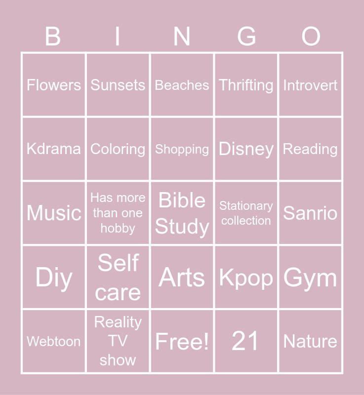 This bingo card has 25 words: Diy, Reality TV show, Bible Study, 21, Introvert, Flowers, Sunsets, Beaches, Stationary collection, Gym, Kdrama, Coloring, Free!, Kpop, Reading, Webtoon, Has more than one hobby, Shopping, Disney, Sanrio, Music, Self care, Arts, Thrifting and Nature.