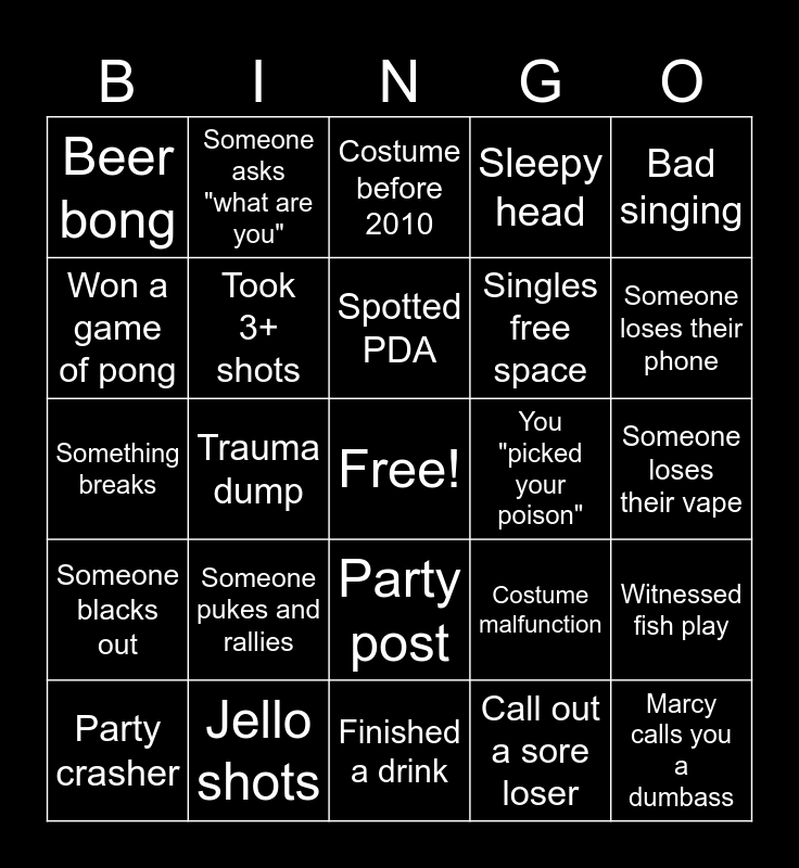 This bingo card has a free space and 29 words: Party crasher, Zoie asks you to smoke, Trauma dump, Party foul, Beer bong, Costume before 2010, Took 3+ shots, Someone pukes and rallies, You "picked your poison", Jello shots, Someone loses their vape, Marcy calls you a dumbass, Finished a drink, Call out a sore loser, Someone loses their phone, Sappy Sydney, Party post, Someone blacks out, Bad singing, Something breaks, Costume malfunction, Party in the USA plays, Singles free space, Won a game of pong, Sleepy head, Someone asks "what are you", Witnessed fish play, Spotted PDA and Couple costume.