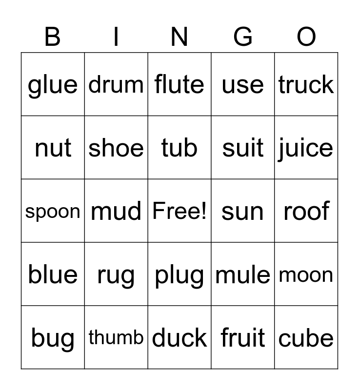 This bingo card has a free space and 24 words: rug, thumb, tub, bug, truck, glue, nut, drum, sun, plug, suit, spoon, mule, moon, shoe, fruit, roof, flute, juice, mud, cube, blue, use and duck.