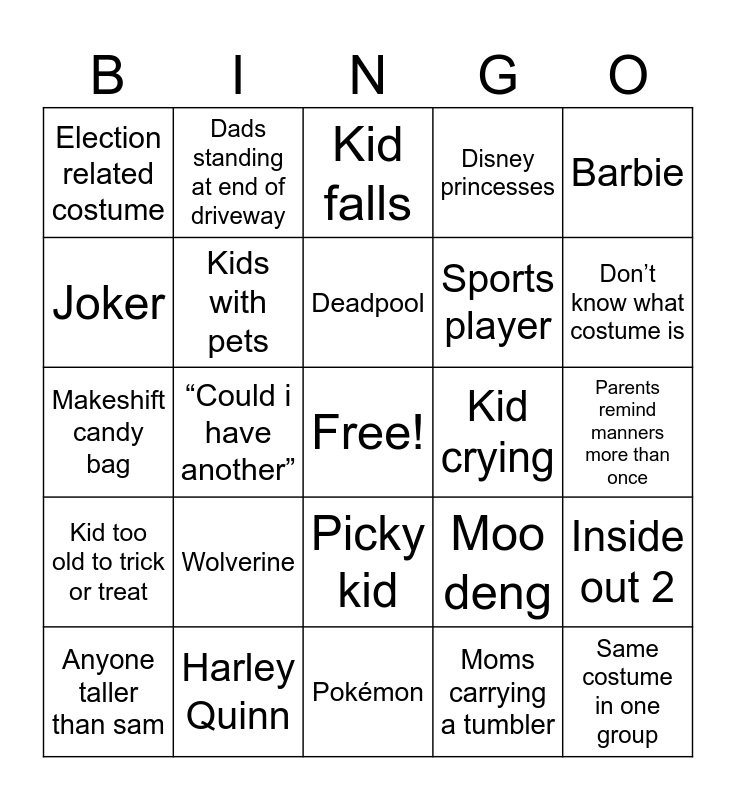 This bingo card has a free space and 24 words: Anyone taller than sam, Wolverine, Deadpool, Moms carrying a tumbler, Barbie, Election related costume, Dads standing at end of driveway, Kid falls, Kid crying, Parents remind manners more than once, Makeshift candy bag, Kids with pets, Moo deng, Inside out 2, Joker, Harley Quinn, Pokémon, Disney princesses, Don’t know what costume is, Kid too old to trick or treat, “Could i have another”, Picky kid, Sports player and Same costume in one group.