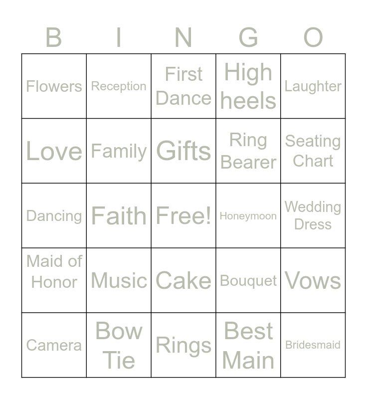 This bingo card has a free space and 24 words: Music, Bow Tie, Gifts, Camera, Laughter, Flowers, Love, Reception, Honeymoon, Cake, Ring Bearer, Dancing, Bouquet, Vows, Family, Best Main, Wedding Dress, First Dance, Seating Chart, Faith, Bridesmaid, Maid of Honor, High heels and Rings.