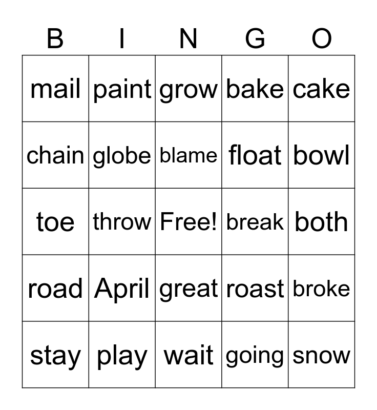 This bingo card has a free space and 24 words: April, play, blame, stay, cake, mail, chain, paint, break, great, float, toe, roast, broke, globe, going, both, grow, bowl, throw, snow, road, bake and wait.