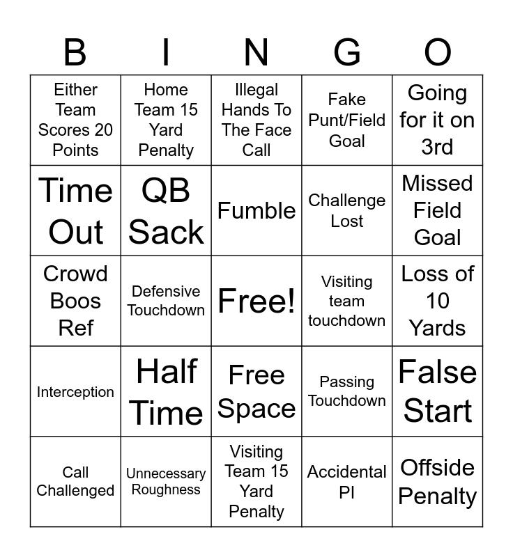 This bingo card has a free space and 36 words: Home team touchdown, Made Field Goal, Two Point Conversion, QB Sack, Passing Touchdown, Interception, Fumble, Touchdown 40 yards, Going for it on 3rd, Trick Play, Defensive Touchdown, Fake Punt/Field Goal, Reversed Call, Visiting team touchdown, Missed Field Goal, Either Team Scores 20 Points, End Zone Celebration, Half Time, Offside Penalty, Illegal Hands To The Face Call, Loss of 10 Yards, False Start, Unnecessary Roughness, Call Challenged, Visiting Team 15 Yard Penalty, Home Team 15 Yard Penalty, Crowd Boos Ref, Challenge Won, Challenge Lost, Time Out, Roughing The Passer, Kickoff Returned For a TD, Accidental PI, Free Space, Roughing The Kicker and Pick 6.