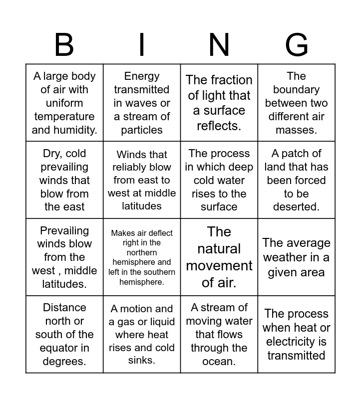 This bingo card has 19 words: The natural movement of air., An example of this would be the temperature outside right now., The fraction of light that a surface reflects., The process when heat or electricity is transmitted, The average weather in a given area, Dry, cold prevailing winds that blow from the east, A stream of moving water that flows through the ocean., A large body of air with uniform temperature and humidity., Energy transmitted in waves or a stream of particles, Prevailing winds blow from the west , middle latitudes., Makes air deflect right in the northern hemisphere and left in the southern hemisphere., Winds that reliably blow from east to west at middle latitudes, The process in which deep cold water rises to the surface, A motion and a gas or liquid where heat rises and cold sinks., Distance north or south of the equator in degrees., Current in a liquid or gas that is kept in motion by gravity., The boundary between two different air masses., A patch of land that has been forced to be deserted. and The average weather in a given area..
