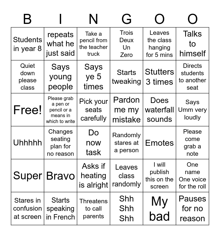 This bingo card has 36 words: Leaves class randomly, Asks if heating is alright, Shh Shh Shh, Quiet down please class, Uhhhhh, Pardon me my mistake, Says young people, Threatens to call parents, Leaves the class hanging for 5 mins, I will publish this on the screen, Directs students to another seat, Trois Deux Un Zero, One name One voice for the roll, Please grab a pen or pencil or a means in which to write, Starts tweaking, Students in year 8, Super, Does waterfall sounds, Free!, Take a pencil from the teacher truck, Pick your seats carefully, Changes seating plan for no reason, Randomly stares at a person, Do now task, Emotes, repeats what he just said, Stutters 3 times, Starts speaking in French, Says ye 5 times, Talks to himself, Pauses for no reason, Stares in confusion at screen, Please come grab a note, Says Umm very loudly, Bravo and My bad.