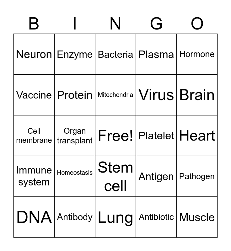 This bingo card has a free space and 24 words: Homeostasis, Antibody, Mitochondria, DNA, Hormone, Neuron, Vaccine, Enzyme, Platelet, Stem cell, Virus, Cell membrane, Antigen, Pathogen, Protein, Antibiotic, Heart, Bacteria, Brain, Organ transplant, Muscle, Immune system, Plasma and Lung.