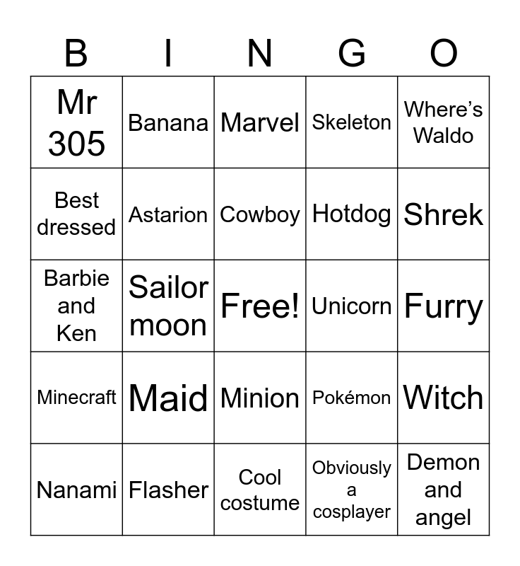 This bingo card has a free space and 24 words: Maid, Flasher, Cowboy, Nanami, Where’s Waldo, Mr 305, Best dressed, Banana, Unicorn, Minion, Hotdog, Barbie and Ken, Pokémon, Witch, Astarion, Obviously a cosplayer, Furry, Marvel, Shrek, Sailor moon, Demon and angel, Minecraft, Skeleton and Cool costume.
