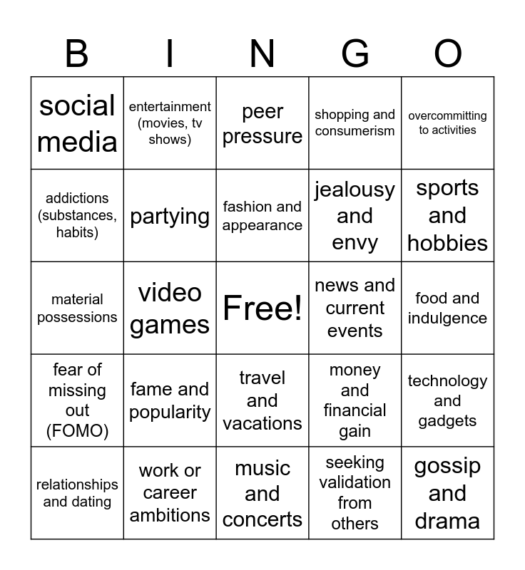 This bingo card has a free space and 26 words: travel and vacations, seeking validation from others, fashion and appearance, work or career ambitions, overcommitting to activities, social media, addictions (substances, habits), entertainment (movies, tv shows), food and indulgence, money and financial gain, jealousy and envy, material possessions, technology and gadgets, relationships and dating, video games, laziness and procrastination, shopping and consumerism, fear of missing out (FOMO), peer pressure, gossip and drama, sports and hobbies, music and concerts, news and current events, fame and popularity, partying and overcommitting to activities.