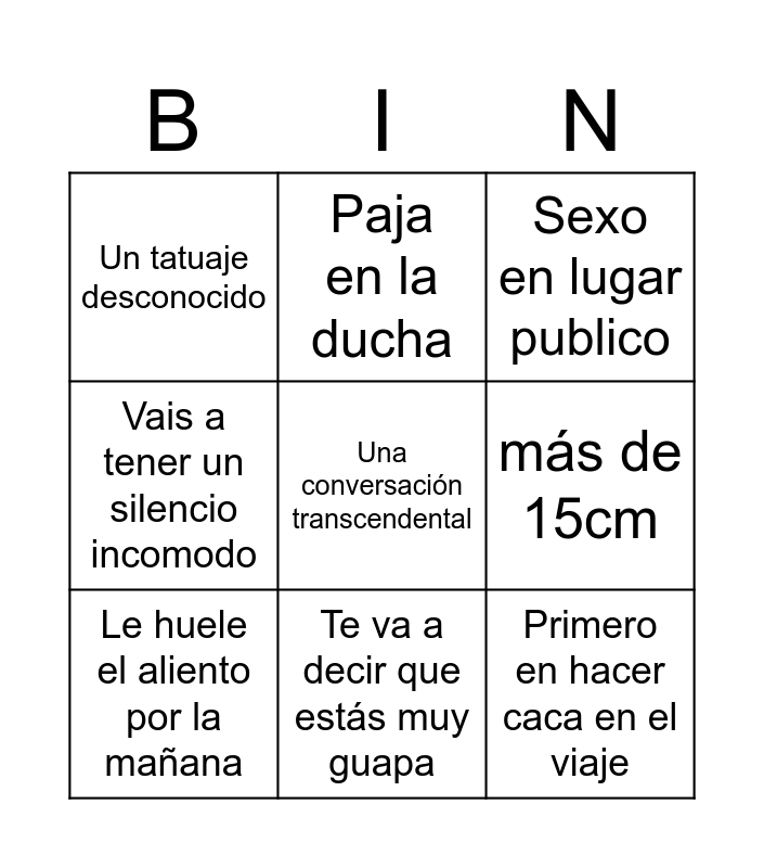 This bingo card has a free space and 8 words: más de 15cm, Sexo en lugar publico, Paja en la ducha, Le huele el aliento por la mañana, Un tatuaje desconocido, Primero en hacer caca en el viaje, Vais a tener un silencio incomodo and Te va a decir que estás muy guapa.