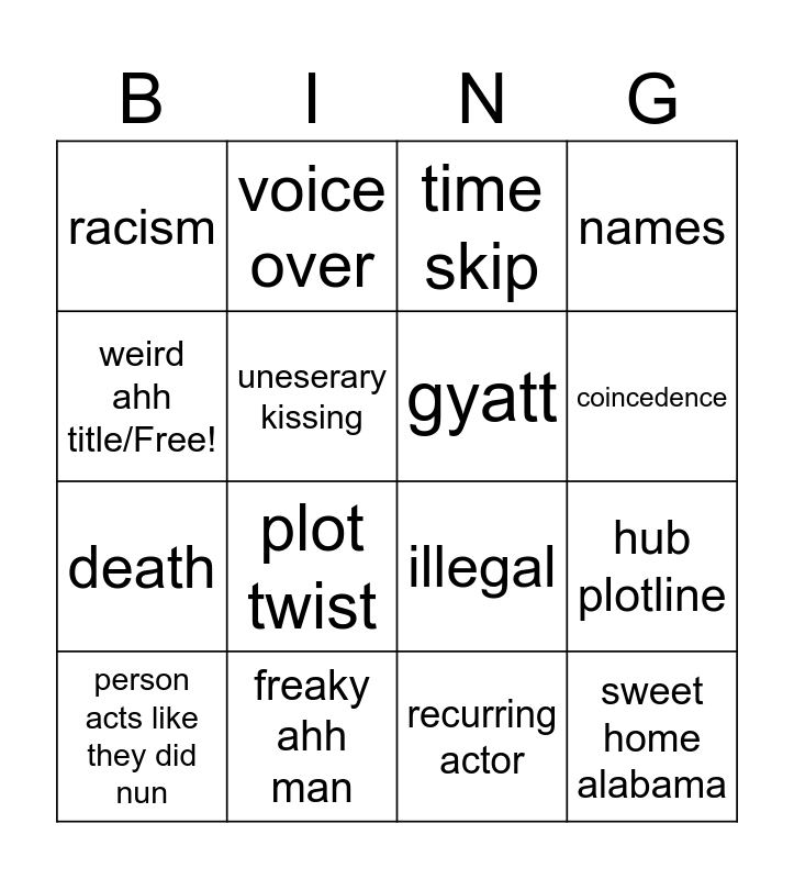 This bingo card has 16 words: freaky ahh man, hub plotline, time skip, racism, death, voice over, illegal, recurring actor, weird ahh title/Free!, uneserary kissing, person acts like they did nun, names, plot twist, coincedence, gyatt and sweet home alabama.