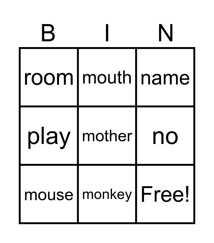 This bingo card has 11 words: Free!, monkey, mother, mouse, mouth, name, no, nose, play, room and yes.