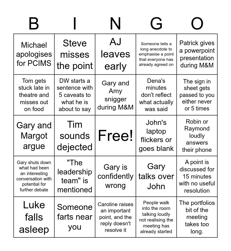 This bingo card has a free space and 25 words: "The leadership team" is mentioned, Caroline raises an important point, and the reply doesn't resolve it, Gary and Amy snigger during M&M, Luke falls asleep, Patrick gives a powerpoint presentation during M&M, Michael apologises for PCIMS, Tom gets stuck late in theatre and misses out on food, Steve misses the point, John's laptop flickers or goes blank, Gary is confidently wrong, Dena's minutes don't reflect what actually was said, Gary and Margot argue, Gary talks over John, A point is discussed for 15 minutes with no useful resolution, DW starts a sentence with 5 caveats to what he is about to say, Ravi can't hear what was said, Robin or Raymond loudly answers their phone, AJ leaves early, The sign in sheet gets passed to you either never or 5 times, Tim sounds dejected, The portfolios bit of the meeting takes too long., Someone farts near you, Gary shuts down what had been an interesting conversation with potential for further debate, Someone tells a long anecdote to emphasise a point that everyone has already agreed on and People walk into the room talking loudly not realising the meeting has already started.