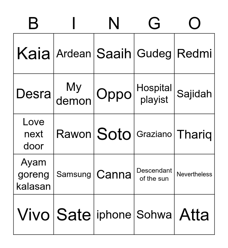 This bingo card has 25 words: Samsung, iphone, Oppo, Vivo, Redmi, Kaia, Desra, Ardean, Graziano, Canna, Hospital playist, Love next door, Descendant of the sun, Nevertheless, My demon, Atta, Thariq, Saaih, Sajidah, Rawon, Soto, Sate, Ayam goreng kalasan, Gudeg and Sohwa.