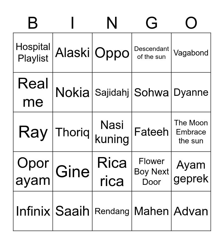 This bingo card has 25 words: Gine, Rendang, Sajidahj, Infinix, Vagabond, Hospital Playlist, Real me, Alaski, Fateeh, Rica rica, Sohwa, Ray, Flower Boy Next Door, Ayam geprek, Nokia, Advan, The Moon Embrace the sun, Oppo, Dyanne, Thoriq, Nasi kuning, Saaih, Opor ayam, Descendant of the sun and Mahen.