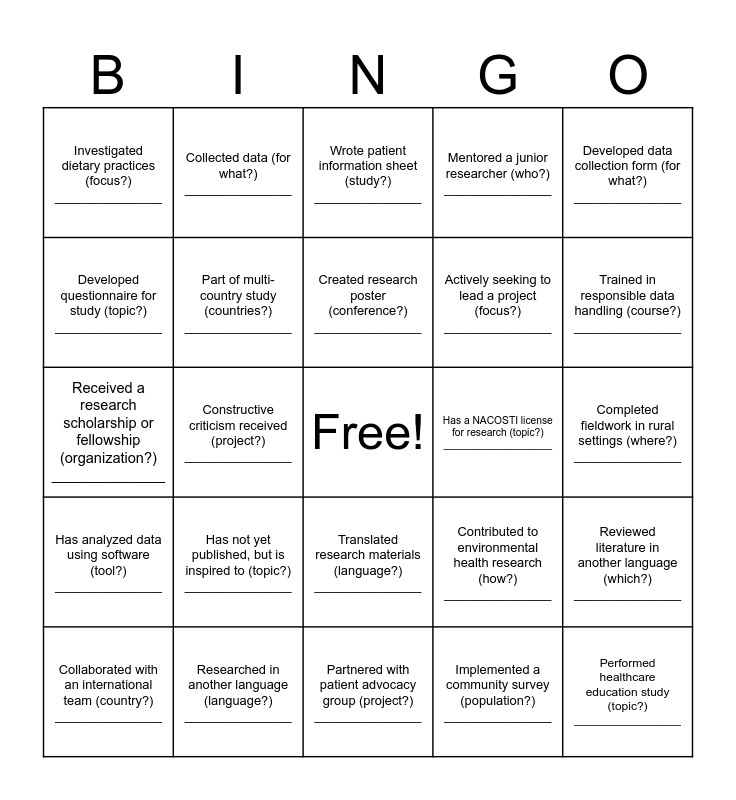 This bingo card has a free space and 136 words: Coordinated maternal health outreach (location?) _______________, Published a case report (topic?) _______________, Participated as a research subject (study?) ______________, Received mentor feedback on draft (topic?) _______________, Developed low-cost intervention (for what?) _______________, Conducted kidney disease study (location?) _______________, Collaborated with an international team (country?) _______________, Used telemedicine in research (for what?) _______________, Worked with medical student researcher (who?) _______________, Engaged with community leaders (how?) _______________, Implemented HIV prevention (community?) _______________, Conducted a retrospective chart review (topic?) _______________, Researched antibiotic prescribing (topic?) _______________, Preparing for first conference (topic?) _______________, Developed project timeline (for what?) _______________, Conducted a meta-analysis (topic?) _______________, Completed research ethics course (which one?) _______________, Revised a paper more than twice (journal?) _______________, Attended an international research conference (where?) _______________, Attended research workshop (where?) _______________, Partnered with patient advocacy group (project?) _______________, Trained others in methods (which ones?) _______________, Wrote patient information sheet (study?) _______________, Analyzed healthcare access trends (area?) _______________, Published on cancer (type?) _______________, Has not yet published, but is inspired to (topic?) _______________, Has a NACOSTI license for research (topic?) ___________________, Written a research proposal (for what?) _______________, Researched barriers to healthcare access (population?) ___________________, Applied for ethics approval (project?) _______________, Has analyzed data using software (tool?) _______________, Received a research scholarship or fellowship (organization?) ______________, Implemented a community survey (population?) _______________, Constructive criticism received (project?) _______________, Analyzed qualitative data (method?) _______________, Collaborated with government health (project?) _______________, Managed data cleaning (study?) _______________, Consulted on a project outside field (which?) _______________, Involved in diabetes education (method?) _______________, Has used Hinari/Research4Life library (topic?) _____________, Performed healthcare education study (topic?) ________________, Written a research book or chapter (topic?) _______________, Recorded podcast or webinar (topic?) _______________, Part of a public health intervention (aim?) _______________, Co-authored a paper (topic?) _______________, Researched in another language (language?) _______________, Conducted research on injury prevention (method?) _______________, Has collaborated with Google Docs (what reason?) _________________, Translated research materials (language?) _______________, Conducted literature review (subject?) _______________, Analyzed healthcare-seeking behaviors (condition?) _______________, Used Excel for data analysis (study?) _______________, Part of longitudinal cohort study (topic?) _______________, Worked with community health workers (role?) _______________, Analyzed healthcare costs (for what?) _______________, Researched immunization rates (location?) _______________, Developed surgical protocols (which?) _______________, Applied for a research grant (funding body?) _______________, Researched patient follow-up rates (condition?) _______________, Contributed to surgical outcomes research (procedure?) _______________, Has used AI in research (application?) _______________, Developed data collection form (for what?) _______________, Developed patient survey (for what?) _______________, Submitted article to regional journal (name?) _______________, Tracked vaccination outcomes (which vaccine?) _______________, Presented local cancer data (where?) _______________, Participated in maternal & child health research (topic?) _______________, Conducted qualitative interview (topic?) _______________, Used software for reference management (which one?) ________________, Collected data (for what?) _______________, Contributed to environmental health research (how?) _______________, Completed fieldwork in rural settings (where?) _______________, Has adapted research methods due to resource limitations (how?) _______________, Organized health screening event (for what?) _______________, Collaborated with interdisciplinary team (focus?) _______________, Presented nationally (conference?) _______________, Created research poster (conference?) _______________, Designed health education materials (topic?) _______________, Investigated dietary practices (focus?) _______________, Used PowerPoint for presentations (subject?) _______________, Published with >5 co-authors (subject?) _______________, Mentored a junior researcher (who?) _______________, Completed NIH Principles of Research Course (when?) ______________, Virtual symposium participant (topic?) _______________, Used REDCap for data collection (study?) _______________, Analyzed factors impacting patient wait times (where?) _______________, Tracked antibiotic use (for what?) _______________, Research was rejected (why?) _______________, Researched pediatric health (topic?) _______________, Completed research skills course (when?) _______________, Used Qualtrics/SurveyMonkey (study?) _______________, Developed questionnaire for study (topic?) _______________, Served on an ethics board (role?) _______________, Used data visualization (tool?) _______________, Peer reviewer for a journal (which?) _______________, Led a randomized controlled trial (disease?) _______________, Research received media attention (for what?) _______________, Used OpenEvidence for clinical care (diagnosis?) __________________, Conducted an epidemiological survey (where?) _______________, Used GI