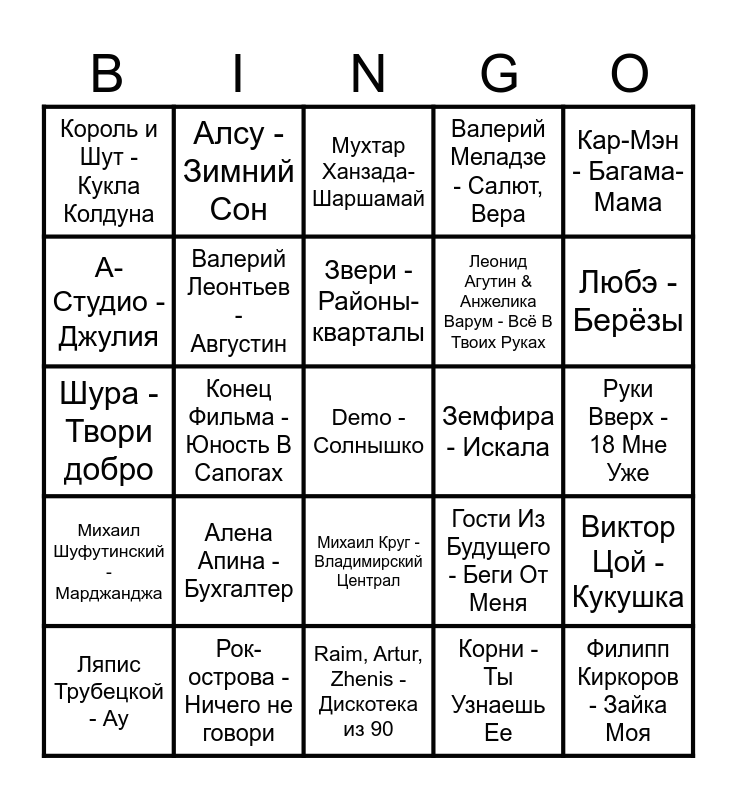 This bingo card has 46 words: ANNA ASTI - Царица, Demo - Солнышко, Dj Smash - Я волна, Raim, Artur, Zhenis - Дискотека из 90, Алена Апина - Бухгалтер, Алла Пугачёва - Позови Меня С Собой, Алсу - Зимний Сон, Аркадий Укупник - Я на тебе никогда не женюсь, А-Студио - Джулия, Баста - Сансара, Валерий Леонтьев - Августин, Валерий Меладзе - Салют, Вера, Виктор Цой - Кукушка, Гости Из Будущего - Беги От Меня, Григорий Лепс - Самый Лучший День, Женя Белоусов - Девчонка-девчоночка, Звери - Районы-кварталы, Земфира - Искала, Ирина Кайратовна - Чина, Кар-Мэн - Багама-Мама, Конец Фильма - Юность В Сапогах, Корни - Ты Узнаешь Ее, Король и Шут - Кукла Колдуна, Леонид Агутин & Анжелика Варум - Всё В Твоих Руках, Леприконсы - Хали Гали, Любэ - Берёзы, Ляпис Трубецкой - Ау, Маким - Знаешь Ли Ты, Михаил Круг - Владимирский Централ, Михаил Шуфутинский - Марджанджа, Мумий Тролль - Невеста, Мурат Насыров - Я Это Ты, Надежда Кадышева - Течет ручей, Натали - Ветер С Моря Дул, Олег Газманов - Морячка, Рок-острова - Ничего не говори, Руки Вверх - 18 Мне Уже, Сектор Газа - Пора домой, Танцы Минус - Город, Фактор 2 - Красавица, Филипп Киркоров - Зайка Моя, Мухтар Ханзада- Шаршамай, Шура - Твори добро, Ю-Питер - Девушка по городу, Юрий Шатунов - Седая Ночь and Ярослав Евдокимов - Фантазер.