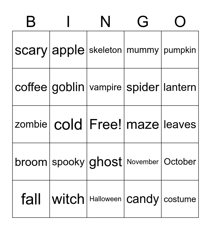 This bingo card has a free space and 25 words: spooky, Halloween, vampire, fall, pumpkin, scary, coffee, apple, maze, ghost, spider, zombie, November, October, goblin, haunt, leaves, skeleton, lantern, cold, costume, witch, broom, mummy and candy.