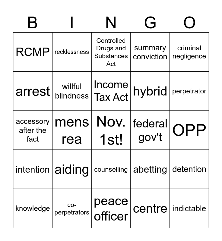 This bingo card has a free space and 33 words: crime, quasi-crime, mens rea, actus reus, intention, willful blindness, criminal negligence, knowledge, recklessness, Criminal Code of Canada, Income Tax Act, Controlled Drugs and Substances Act, guilty act, guilty mind, federal gov't, perpetrator, co-perpetrators, accessory after the fact, aiding, abetting, counselling, party to common intention, RCMP, OPP, peace officer, indictable, summary conviction, hybrid, arrest, detention, perimeter, centre and Chain of Custody.