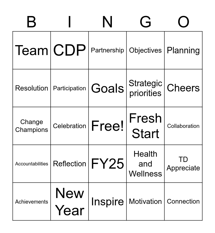 This bingo card has a free space and 24 words: Reflection, New Year, Goals, Achievements, Planning, Team, Resolution, CDP, Fresh Start, FY25, Strategic priorities, Change Champions, Health and Wellness, TD Appreciate, Participation, Motivation, Collaboration, Partnership, Cheers, Celebration, Connection, Accountabilities, Objectives and Inspire.