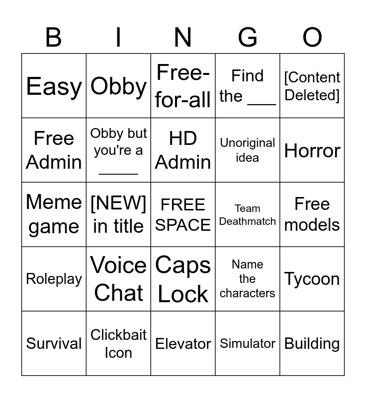 This bingo card has a free space and 24 words: Voice Chat, Clickbait Icon, HD Admin, Survival, [Content Deleted], Easy, Free Admin, Obby, Team Deathmatch, Caps Lock, Unoriginal idea, Meme game, Name the characters, Tycoon, Obby but you're a _____, Simulator, Free models, Free-for-all, Horror, [NEW] in title, Building, Roleplay, Find the ___ and Elevator.