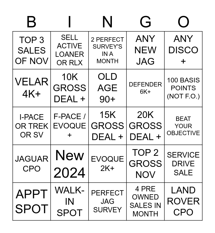 This bingo card has 25 words: New 2024, PERFECT JAG SURVEY, OLD AGE 90+, APPT SPOT, ANY DISCO +, TOP 3 SALES OF NOV, VELAR 4K+, SELL ACTIVE LOANER OR RLX, 20K GROSS DEAL +, EVOQUE 2K+, DEFENDER 6K+, I-PACE OR TREK OR SV, TOP 2 GROSS NOV, SERVICE DRIVE SALE, 10K GROSS DEAL +, LAND ROVER CPO, BEAT YOUR OBJECTIVE, 2 PERFECT SURVEY'S IN A MONTH, 100 BASIS POINTS (NOT F.O.), F-PACE / EVOQUE +, 15K GROSS DEAL +, WALK-IN SPOT, JAGUAR CPO, ANY NEW JAG and 4 PRE OWNED SALES IN MONTH.