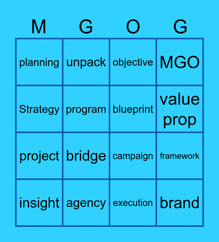 This bingo card has 36 words: thick data, water through the pipes, brief, blueprint, double click, brand, value prop, workfront, Strategy, messaging, framework, MGO, Sharepoint, agency, bridge, planning, artifact, customer, insight, objective, execution, deep dive, sleep, sponsor, joy, unpack, campaign, manager, project, program, optimization, KPIs, Insightful, AMP, dashboard and document.