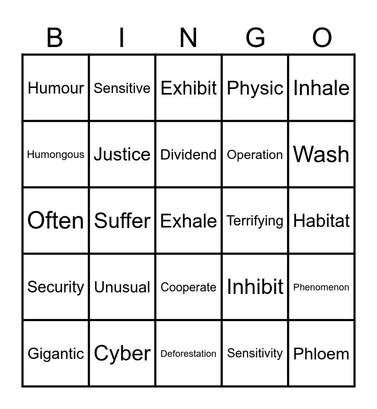 This bingo card has 25 words: Security, Cyber, Exhale, Sensitivity, Inhale, Humour, Sensitive, Exhibit, Terrifying, Phenomenon, Humongous, Justice, Deforestation, Inhibit, Wash, Gigantic, Suffer, Dividend, Operation, Habitat, Often, Unusual, Cooperate, Physic and Phloem.