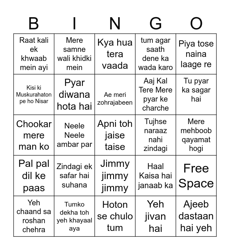 This bingo card has 48 words: Tu tu hai wohi, dil ne jise, Apni toh jaise taise, Hai apna dil toh awara, Hoton se chulo tum, Zindagi ek safar hai suhana, Chodo kal ki baatein kal ki baat purani, Mere samne wali khidki mein, Aane se uske aaye bahaar, Kisi ki Muskurahaton pe ho Nisar, Ek ladki ko dekha toh aisa laga, Pyar diwana hota hai, tum agar saath dene ka wada karo, Free Space, Haal Kaisa hai janaab ka, Gaata rahe mera dil, Bade achche lagte hain, Ae meri zohrajabeen, Tujhse naraaz nahi zindagi, Pardesiya ye sach hai piya, Piya tose naina laage re, Neele Neele ambar par, Yeh jivan hai, Raat kali ek khwaab mein ayi, Aaj Kal Tere Mere pyar ke charche, Sandese aate hai hume tadpate hai, Tu pyar ka sagar hai, Yeh chaand sa roshan chehra, Dil diya hai jaan bhi denge, Jimmy jimmy jimmy, Pal pal dil ke paas, Wo kagaz ki kashti, O saathi re tere bina bhi, Main zindagi ka saath nibhaata chala gaya, Lag Ja Gale Ke Phir Ye, Tumko dekha toh yeh khayaal aya, Ek pyar ka nagma hai, Papa kehte hain, Mere mehboob qayamat hogi, Chalte chalte mere yeh geet, Dared ae dil dard ae jigar, Jab koi baat bigad jaaye, Ajeeb dastaan hai yeh, Kya hua tera vaada, Dekha ek khwaab toh yeh, Chookar mere man ko, Chura liya hai tumne jo, Ek main aur ek tu and Sawan ka mahina.