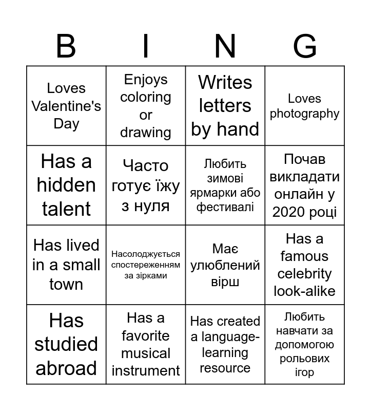 This bingo card has 305 words: Free!, Has taught English as a second language, Speaks more than three languages, Has worked in a different industry before teaching, Has created a language-learning resource, Has taught English as a second language, Speaks more than three languages, Has worked in a different industry before teaching, Has created a language-learning resource, Started teaching online in 2020, Is a certified neurolanguage coach, Uses the Lexical Approach in teaching, Prefers teaching adults over children, Has lived in more than one country, Has a favorite grammar point to teach, Loves learning about etymology, Has developed a language game for students, Prefers teaching vocabulary over grammar, Has helped a student pass an important exam, Is learning a new language now, Has a unique teaching philosophy, Prefers group classes over one-on-one sessions, Has experience with neuro-linguistic programming (NLP), Uses storytelling in their lessons, Enjoys teaching through role-playing activities, Loves to cook or bake, Has run a marathon or participated in a race, Has a pet, Is a morning person, Enjoys journaling, Does yoga or meditation regularly, Collects something unique, Has a favorite musical instrument, Practices a craft like knitting or painting, Is a talented singer or musician, Loves gardening, Has a favorite podcast, Enjoys public speaking, Writes poetry or short stories, Prefers e-books over physical books, Loves attending concerts or live shows, Volunteers regularly, Has a green thumb, Loves trivia games or quizzes, Enjoys outdoor activities like hiking or camping, Has traveled to over 10 countries, Has lived in a small town, Has been on a solo trip, Has studied abroad, Speaks a rare or unusual language, Loves exploring art museums, Can name their favorite travel destination, Prefers spontaneous trips over planned itineraries, Knows how to dance traditional folk dances, Has made friends while traveling abroad, Loves experiencing new cuisines, Has tried an extreme sport while traveling, Can say "hello" in five languages, Has tried street food from a foreign country, Prefers the mountains over the beach, Collects souvenirs from each country visited, Has visited a famous historical site, Enjoys travel photography, Loves learning about local customs, Has experienced an unexpected adventure while traveling, Was born in a different country, Can do a party trick, Knows all the lyrics to a song by heart, Has won a random contest, Has a hidden talent, Prefers salty snacks over sweet ones, Has never broken a bone, Has a phobia of something unusual, Is good at solving riddles, Has a favorite cartoon character, Has read a book in one day, Prefers tea over coffee, Is left-handed, Has a favorite animal (and can explain why!), Loves spicy food, Has a unique nickname, Has a famous celebrity look-alike, Enjoys stargazing, Has met someone famous, Knows a lot about mythology, Has a favorite season, Loves decorating for holidays, Has a go-to holiday movie, Prefers Halloween over Christmas, Bakes seasonal treats, Has participated in a winter sports activity, Enjoys pumpkin spice lattes, Sends holiday cards to family and friends, Has a unique family holiday tradition, Loves New Year's Eve celebrations, Decorates a real Christmas tree, Enjoys summer barbecues, Prefers fireworks over parades, Can’t get enough of autumn foliage, Enjoys winter markets or festivals, Has spent a holiday in another country, Loves Valentine's Day, Wears themed sweaters or accessories, Is an early holiday shopper, Likes to make handmade gifts, Loves morning coffee or tea rituals, Prefers staying up late, Works out regularly, Reads before bed, Uses a to-do list daily, Takes short breaks to stay focused, Keeps a daily gratitude journal, Prefers writing in pen rather than typing, Uses an app to track habits, Has a favorite productivity hack, Cooks meals from scratch often, Is a great multitasker, Swears by meal-prepping, Can’t go a day without checking social media, Takes a daily walk for fresh air, Has a cozy work-from-home setup, Does weekly meal planning, Checks the news daily, Has a motivational quote posted near their desk, Keeps their workspace very organized, Has taken an art class, Loves photography, Writes in a blog or diary, Prefers museums over galleries, Knows how to sew or knit, Enjoys coloring or drawing, Has painted a canvas, Likes playing with home decor, Loves sharing personal stories, Has a favorite poem, Can play an instrument, Has a personal art style, Is good at making up stories, Writes letters by hand, Enjoys acting or theater, Makes playlists for different moods, Loves calligraphy or lettering, Enjoys making DIY crafts, Draws in a sketchbook, Has performed in front of an audience, Loves hosting get-togethers, Has a best friend from childhood, Enjoys sending handwritten letters, Is always the one organizing meetups, Has a group chat with friends, Enjoys giving thoughtful gifts, Loves playing board games with friends, Makes friends easily, Prefers deep conversations over small talk, Always remembers birthdays, Викладав англійську як другу мову, Володіє більше ніж трьома мовами, Працював в іншій галузі до викладання, Створив ресурс для вивчення мови, Почав викладати онлайн у 2020 році, Є сертифікованим нейролінгвістичним коучем, Використовує лексичний підхід у викладанні, Віддає перевагу викладанню дорослим, а не дітям, Жив у більше ніж одній країні, Має улюблену граматичну тему для викладання, Любить вивчати етимологію, Розробив мовну гру для учнів, Віддає перевагу викладанню словникового запас