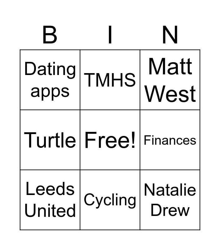 This bingo card has a free space and 9 words: Leeds United, Matt West, TMHS, Turtle, Dating apps, Finances, Natalie Drew, Behaviour and Cycling.