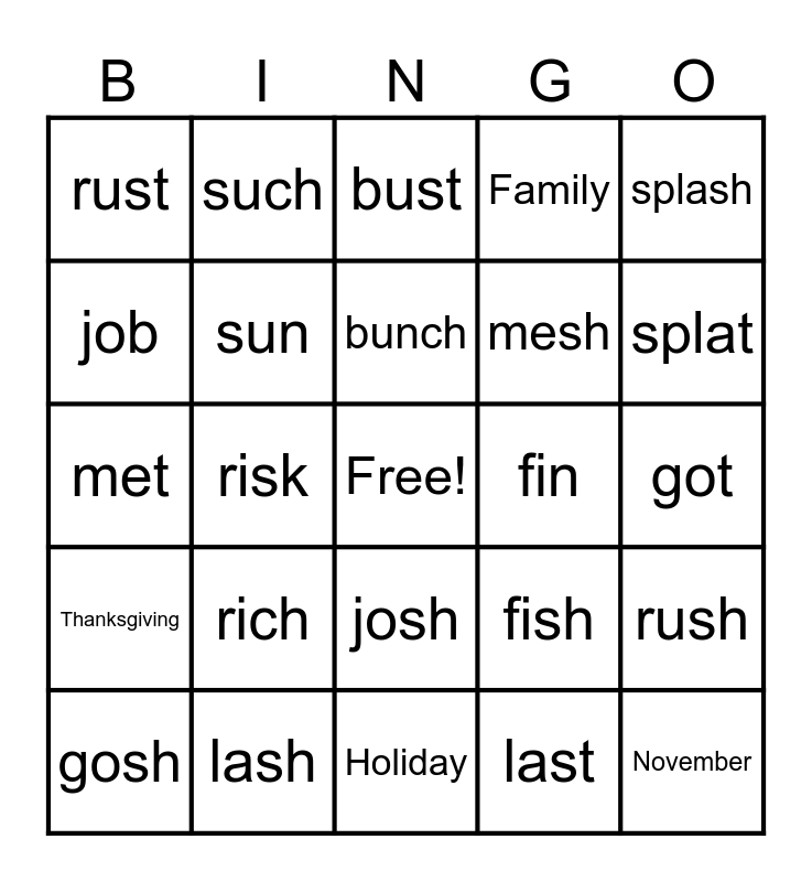 This bingo card has a free space and 24 words: rich, lash, bunch, gosh, splash, rust, job, such, fin, josh, mesh, met, fish, rush, sun, last, got, bust, splat, risk, November, Thanksgiving, Family and Holiday.