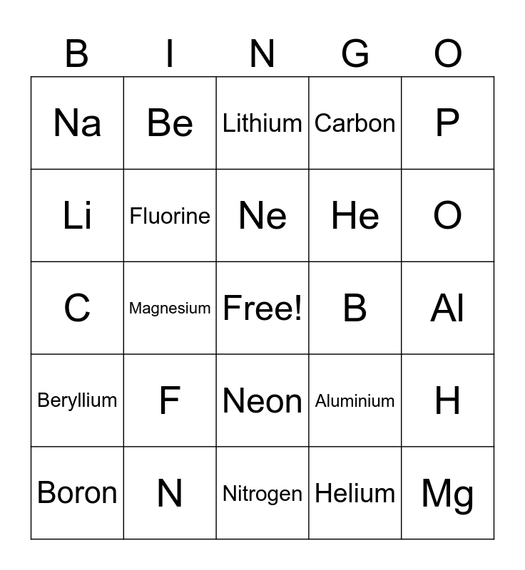 This bingo card has a free space and 28 words: H, Hydrogen, He, Helium, Li, Lithium, Be, Beryllium, B, Boron, C, Carbon, N, Nitrogen, O, Oxygen, F, Fluorine, Ne, Neon, Na, Sodium, Mg, Magnesium, Al, Aluminium, P and Phosphorus.