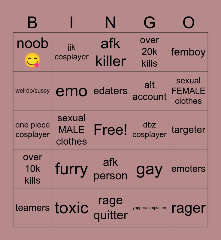This bingo card has a free space and 24 words: furry, toxic, edaters, teamers, femboy, noob😋, weirdo/sussy, jjk cosplayer, dbz cosplayer, afk person, alt account, one piece cosplayer, gay, emoters, emo, yapper/complainer, targeter, afk killer, sexual FEMALE clothes, sexual MALE clothes, rager, over 10k kills, over 20k kills and rage quitter.