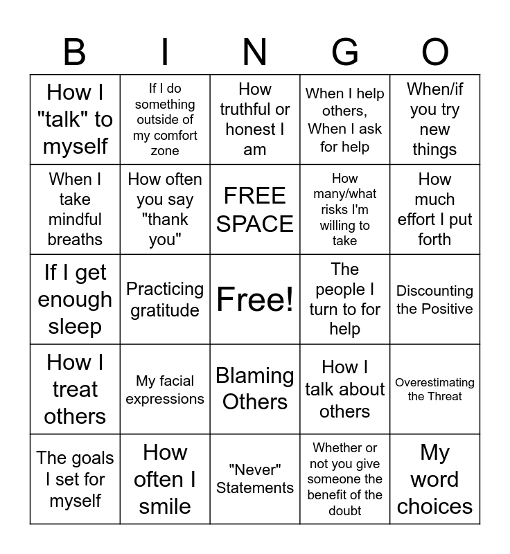 This bingo card has a free space and 89 words: Catastrophizing, Self-Blaming, Blaming Others, Feelings are Facts, Judging, Labeling, Forecasting, Exaggerating, Filtering, Mindreading, Cognitive Distortion, Black or White Thinking, Overestimating the Threat, Discounting the Positive, Overgeneralization, FREE SPACE, CBT, Fact Check, Minimizing, Reframe, "Should" Statements, "Always" Statements, "Never" Statements, If I get enough sleep, If I get enough sleep, How often I smile, Owning up to my mistakes, Setting boundaries, Whether or not I keep my word, If I act according to my values, When I help others, When I ask for help, Practicing gratitude, Treating myself with kindness, How I "talk" to myself, When/if I forgive others, How truthful or honest I am, When I take mindful breaths, When/if I try again, How much effort I put forth, The goals I set for myself, How I treat others, When I remind myself I am worthy, How I take care of myself, How I respond to challenges, How I talk about others, The people I turn to for help, When/where I say yes, When/where I say no, If I accept my feelings, If I do something outside of my comfort zone, When/if I forgive myself, What social medias I follow, My priorities, The people I listen to, The effort I put in to something, What I do with my racing thoughts, How I respond to regret, How I respond to anger, The people I surround myself with, The perspectives I change, My patience, What I do with my envy/jealousy, How often I brush my teeth, shower, or take care of my space, My morning or evening routines, How I soothe myself, Whether I explore my dreams, intentions, and fears, What I do with my dreams, intentions, and fears, What I learn from my missteps, mistakes, missed opportunities, bad decisions, tough times, My facial expressions, My word choices, My body language, The clothes I wear, How many/what risks I'm willing to take, How often you say "thank you", Whether or not you give someone the benefit of the doubt, Whether or not you compete with those around you, When you walk away from a conversation, Whether you listen or wait to talk, How often you notice/appreciate small acts of kindness, When/if you try new things, How much/long you spend trying to convince someone you're right, Which commitments you keep and cancel, Whether you formulate a new plan or act on your existing one, How much information you get before you make a decision, How much information you share with people, Whether or not you judge other people, How quickly you try again after you fall and How often you tune into your senses to pull yourself into the moment.