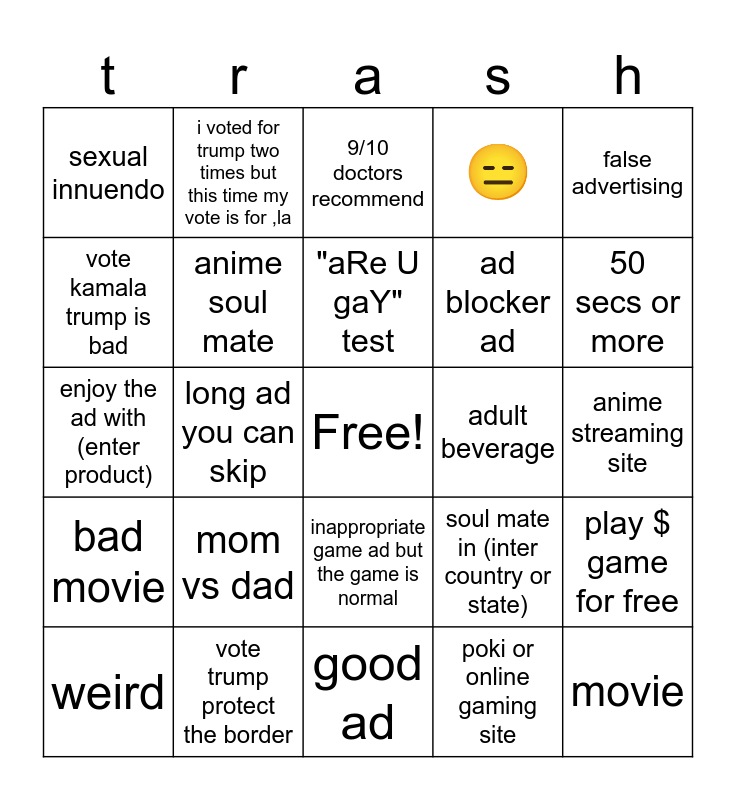This bingo card has a free space and 24 words: mom vs dad, vote trump protect the border, "aRe U gaY" test, weird, false advertising, sexual innuendo, vote kamala trump is bad, i voted for trump two times but this time my vote is for ,la, adult beverage, inappropriate game ad but the game is normal, ad blocker ad, enjoy the ad with (enter product), soul mate in (inter country or state), play $ game for free, anime soul mate, poki or online gaming site, anime streaming site, 9/10 doctors recommend, 50 secs or more, long ad you can skip, movie, bad movie, 😑 and good ad.