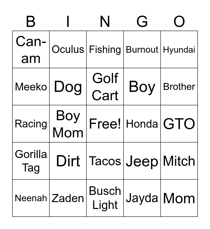 This bingo card has a free space and 28 words: Mitch, Mollie, Boy, Jayda, Meeko, Fishing, Oculus, Gorilla Tag, Honda, Neenah, Racing, Burnout, Zaden, Busch Light, Brother, Packers, Dirt, Dog, Golf Cart, Tacos, Can-am, Dad, Mom, Boy Mom, GTO, Jeep, Hyundai and Son.