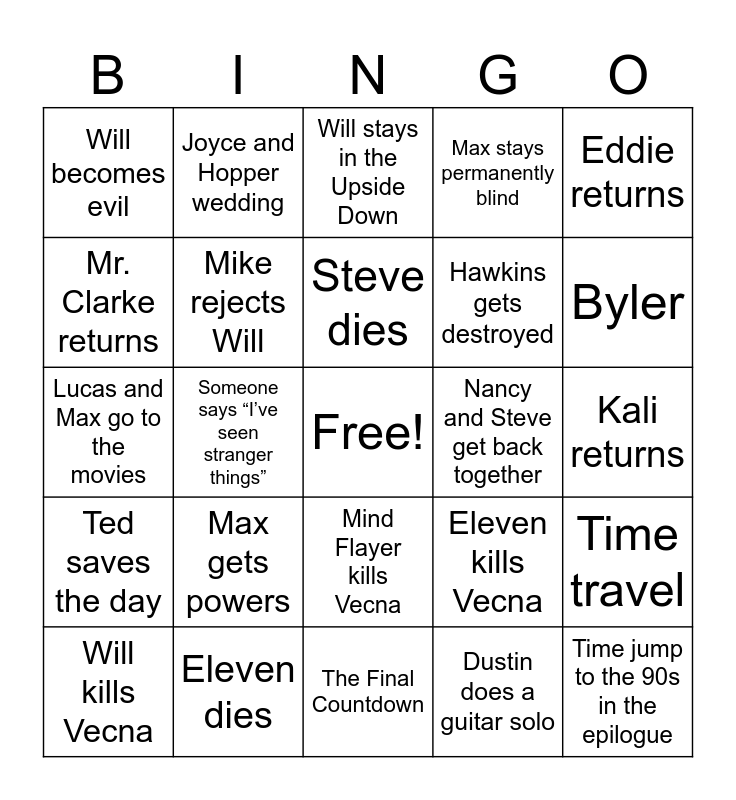 This bingo card has a free space and 24 words: Max gets powers, Eleven dies, Steve dies, Will kills Vecna, Eddie returns, Will becomes evil, Mr. Clarke returns, Joyce and Hopper wedding, Nancy and Steve get back together, Mind Flayer kills Vecna, Hawkins gets destroyed, Lucas and Max go to the movies, Eleven kills Vecna, Time travel, Mike rejects Will, Dustin does a guitar solo, Kali returns, Will stays in the Upside Down, Byler, Someone says “I’ve seen stranger things”, Time jump to the 90s in the epilogue, Ted saves the day, Max stays permanently blind and The Final Countdown.
