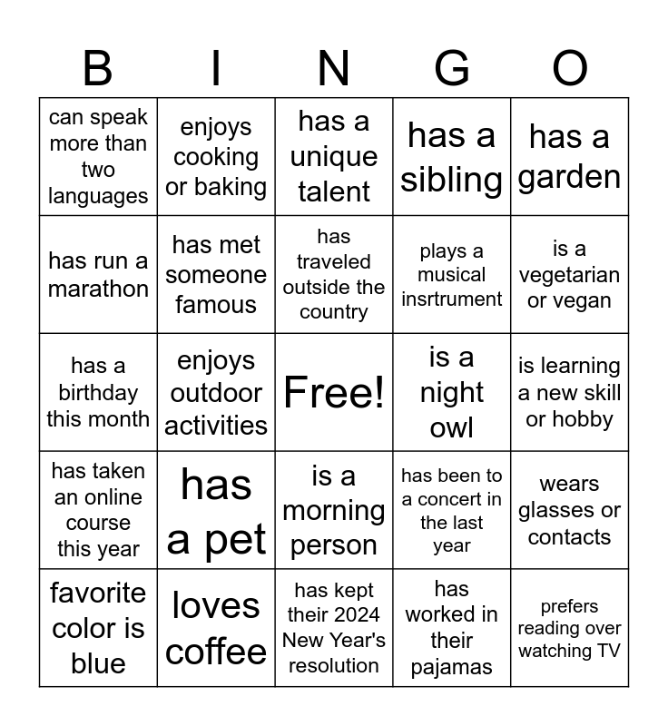 This bingo card has a free space and 24 words: has a pet, loves coffee, has traveled outside the country, favorite color is blue, has a garden, can speak more than two languages, has run a marathon, enjoys cooking or baking, is a night owl, is a morning person, plays a musical insrtrument, has a birthday this month, has been to a concert in the last year, wears glasses or contacts, has met someone famous, has worked in their pajamas, is learning a new skill or hobby, has a unique talent, is a vegetarian or vegan, enjoys outdoor activities, prefers reading over watching TV, has taken an online course this year, has a sibling and has kept their 2024 New Year's resolution.