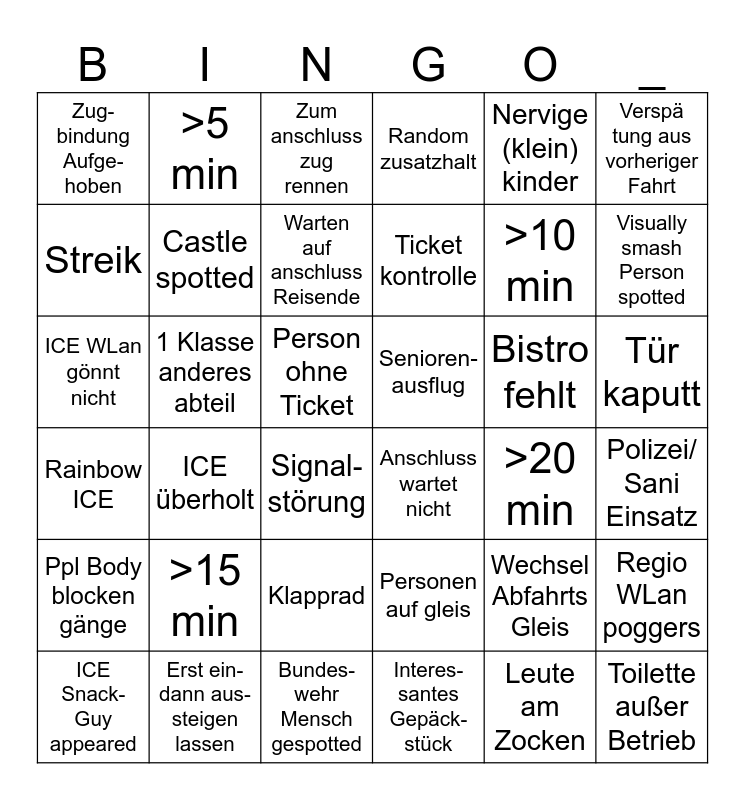 This bingo card has 36 words: Rainbow ICE, ICE überholt, Bundes-wehr Mensch gespotted, Ticket kontrolle, Bistro fehlt, Tür kaputt, Zug-bindung Aufge-hoben, Erst ein- dann aus-steigen lassen, Zum anschluss zug rennen, Personen auf gleis, >10 min, Verspä tung aus vorheriger Fahrt, Ppl Body blocken gänge, 1 Klasse anderes abteil, Warten auf anschluss Reisende, Random zusatzhalt, Wechsel Abfahrts Gleis, Polizei/ Sani Einsatz, Streik, Castle spotted, Signal- störung, Anschluss wartet nicht, >20 min, Regio WLan poggers, ICE WLan gönnt nicht, >5 min, Person ohne Ticket, Interes-santes Gepäck-stück, Nervige (klein) kinder, Visually smash Person spotted, ICE Snack-Guy appeared, >15 min, Klapprad, Senioren- ausflug, Leute am Zocken and Toilette außer Betrieb.