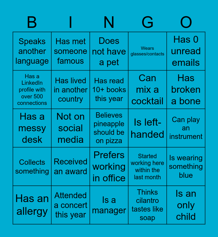 This bingo card has 30 words: Attended a concert this year, Has worked here for 10+ years, Not on social media, Can't function w/o coffee, Speaks another language, Does not have a pet, Has lived in another country, Prefers working in office, Is left-handed, Is a manager, Can play an instrument, Believes pineapple should be on pizza, Thinks cilantro tastes like soap, Is an only child, Has broken a bone, Was born in the same month as you, Started working here within the last month, Collects something, Received an award, Has 0 unread emails, Has a messy desk, Has had an 1+ hr commute, Has met someone famous, Can mix a cocktail, Has a LinkedIn profile with over 500 connections, Wears glasses/contacts, Is wearing something blue, Has an allergy, Has read 10+ books this year and Is a night owl.