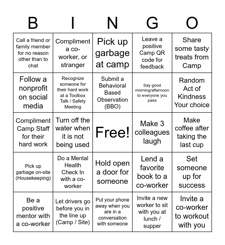 This bingo card has a free space and 24 words: Be a positive mentor with a co-worker, Do a Mental Health Check In with a co-worker, Submit a Behavioral Based Observation (BBO), Invite a new worker to sit with you at lunch / supper, Share some tasty treats from Camp, Call a friend or family member for no reason other than to chat, Compliment a co-worker, or stranger, Pick up garbage at camp, Make 3 colleagues laugh, Make coffee after taking the last cup, Compliment Camp Staff for their hard work, Recognize someone for their hard work at a Toolbox Talk / Safety Meeting, Lend a favorite book to a co-worker, Set someone up for success, Follow a nonprofit on social media, Let drivers go before you in the line up (Camp / Site), Put your phone away when you are in a conversation with someone, Leave a positive Camp QR code for feedback, Random Act of Kindness Your choice, Pick up garbage on-site (Housekeeping), Turn off the water when it is not being used, Hold open a door for someone, Say good morning/afternoon to everyone you pass and Invite a co-worker to workout with you.
