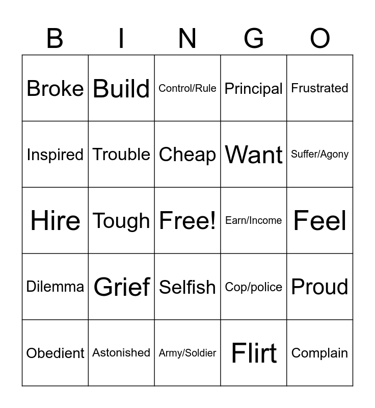 This bingo card has a free space and 34 words: Appear, Flirt, Ashamed, Hurt, Dilemma, Trouble, Frustrated, Obedient, Build, stressed, Cheap, Control/Rule, Dollars, Envy, Earn/Income, Suffer/Agony, Astonished, Hire, Grief, Cop/police, Selfish, Contradict, Broke, Feel, Army/Soldier, Complain, Principal, Boss, Want, Inspired, Brag, Tough, Proud and Lonely.