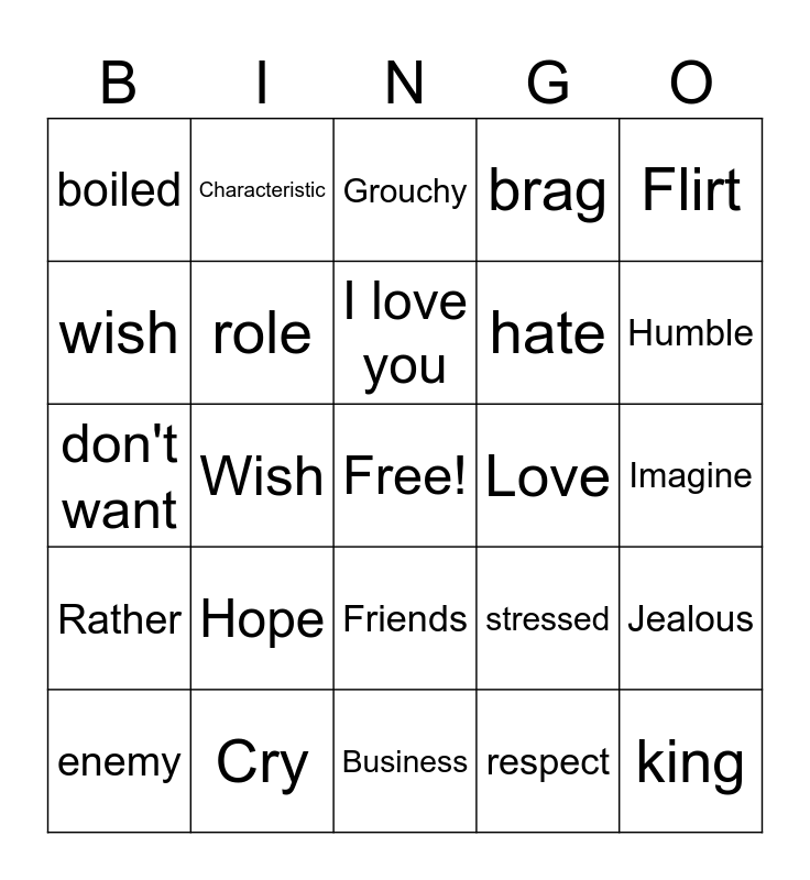 This bingo card has a free space and 24 words: Hope, Cry, I love you, enemy, Flirt, boiled, wish, Characteristic, Love, Friends, hate, don't want, stressed, Jealous, role, respect, Imagine, Grouchy, Humble, Wish, king, Rather, brag and Business.
