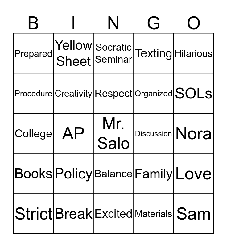 This bingo card has 25 words: Policy, Excited, Respect, Strict, Hilarious, Prepared, Procedure, Yellow Sheet, Discussion, Balance, Organized, College, Family, Love, Creativity, Sam, Nora, Socratic Seminar, SOLs, AP, Mr. Salo, Break, Books, Texting and Materials.